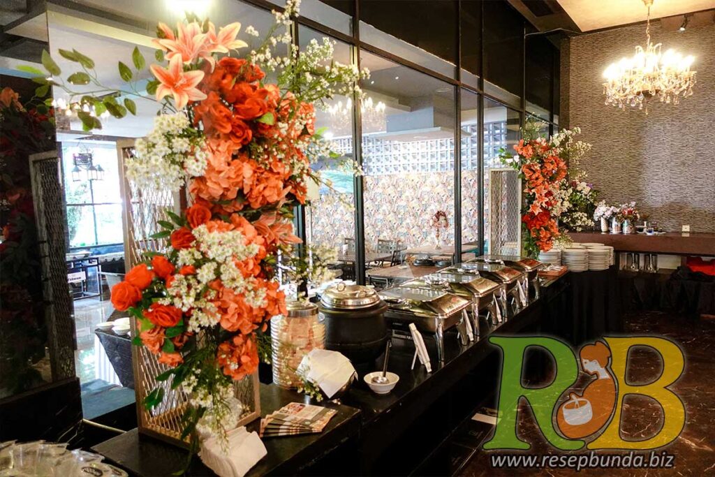 Paket catering yang dipesan untuk acara ini yaitu Paket & Catering dengan 400 porsi tamu undangan yang kami sediakan sudah termasuk fasilitas area VIP pengantin, Mini buffet VIP, Meja & Alat buffet, Alat makan, Roundtable, Waitress, Clear up tidak lupa juga disertai dengan berbagai properti dekorasi catering yang cantik dan menarik disesuaikan dengan tema dari acara pernikahan ini yaitu modern.
